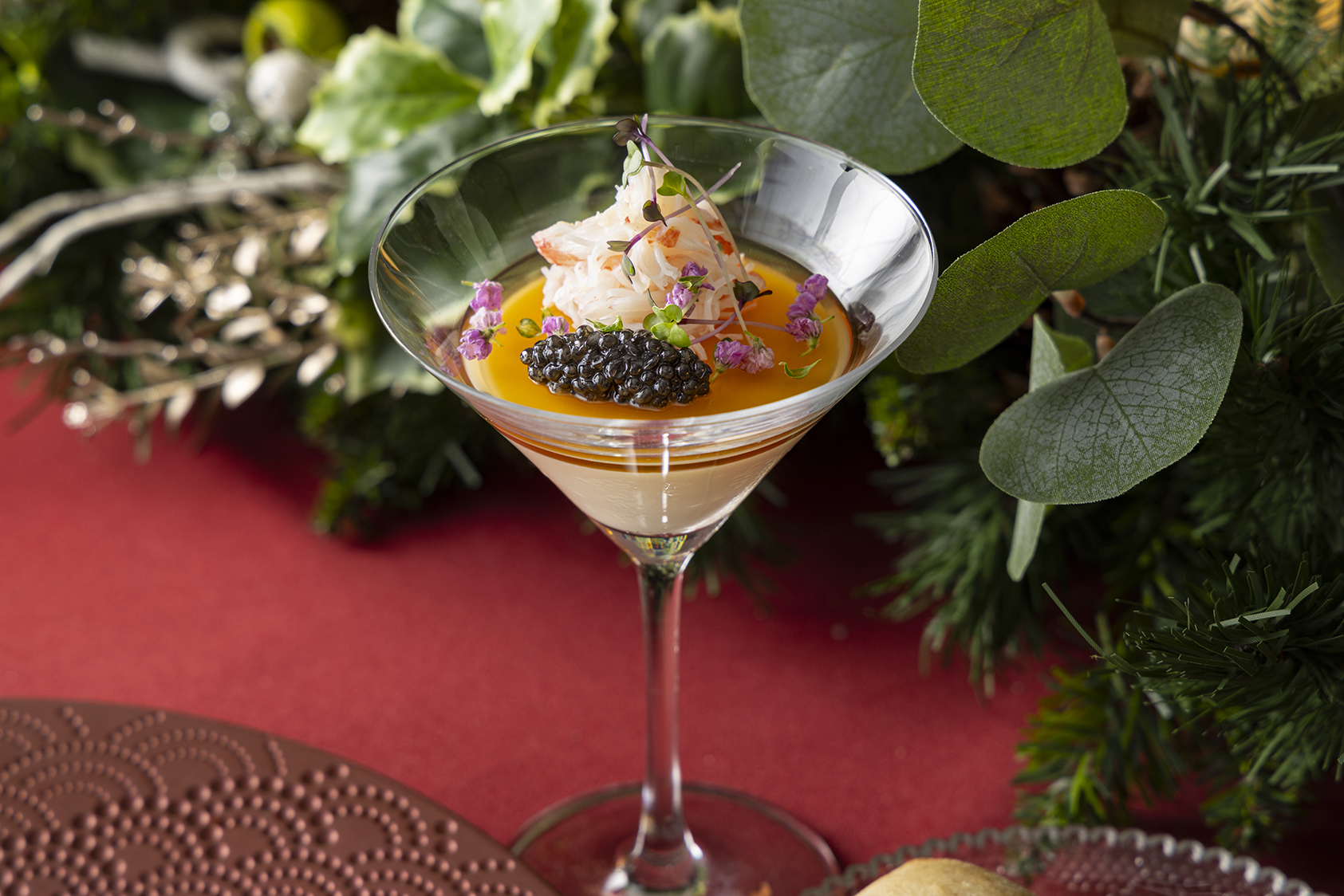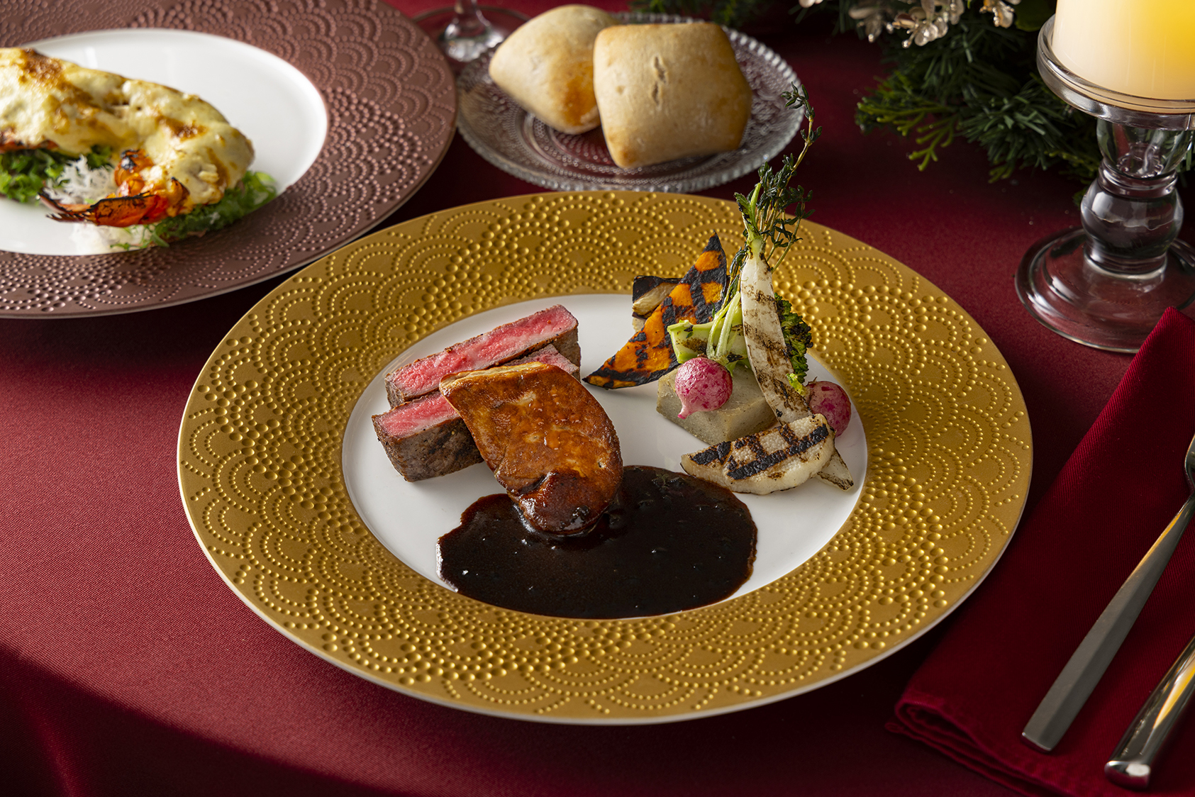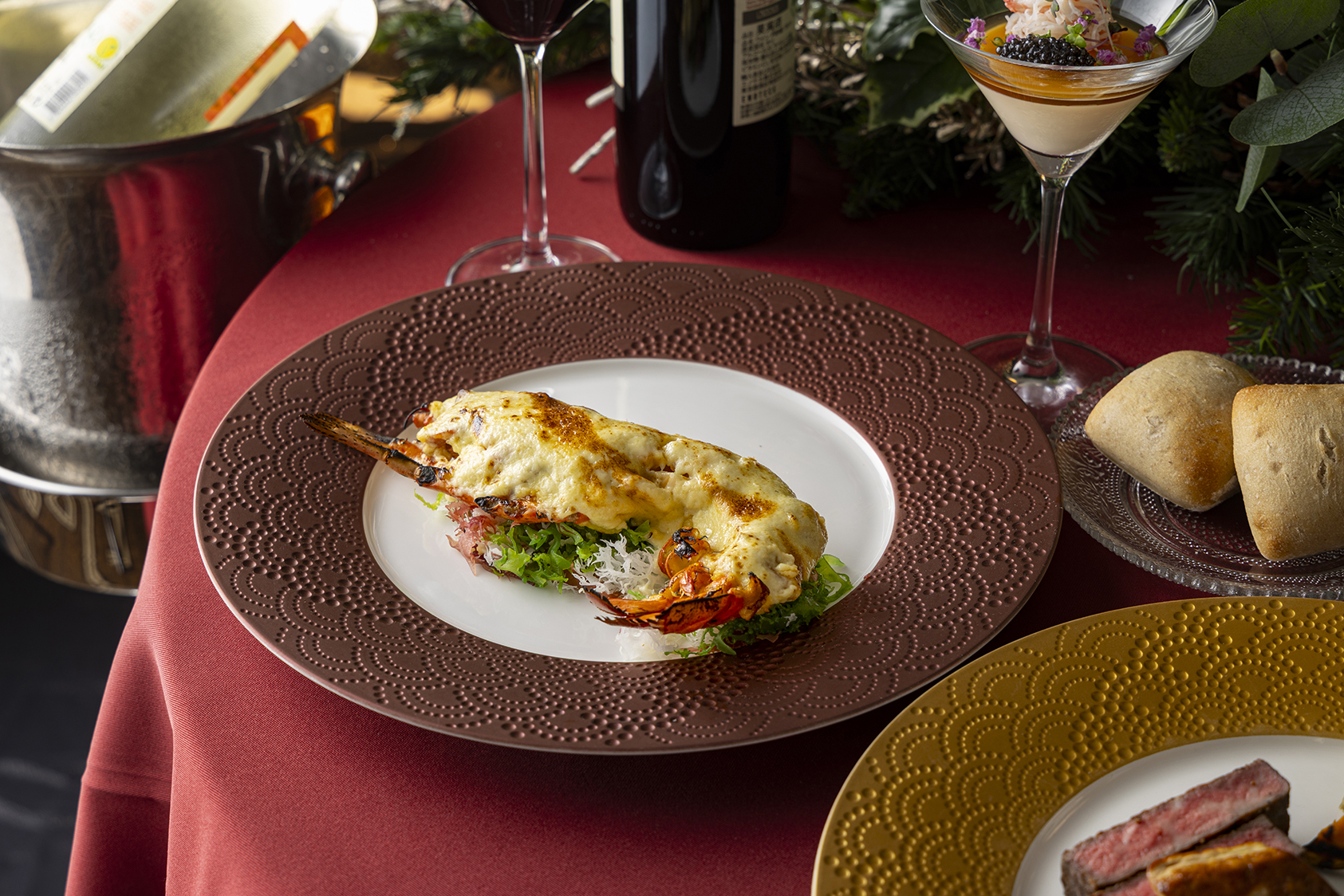 シェフが一皿ずつ丁寧に仕立てる「クリスマススペシャルコース」。メインディッシュには、「オマール海老のテルミドール」と「和牛ステーキとフォアグラのロッシーニ風」をご用意。落ち着いた空間で、思い出に残るディナーをお楽しみください。