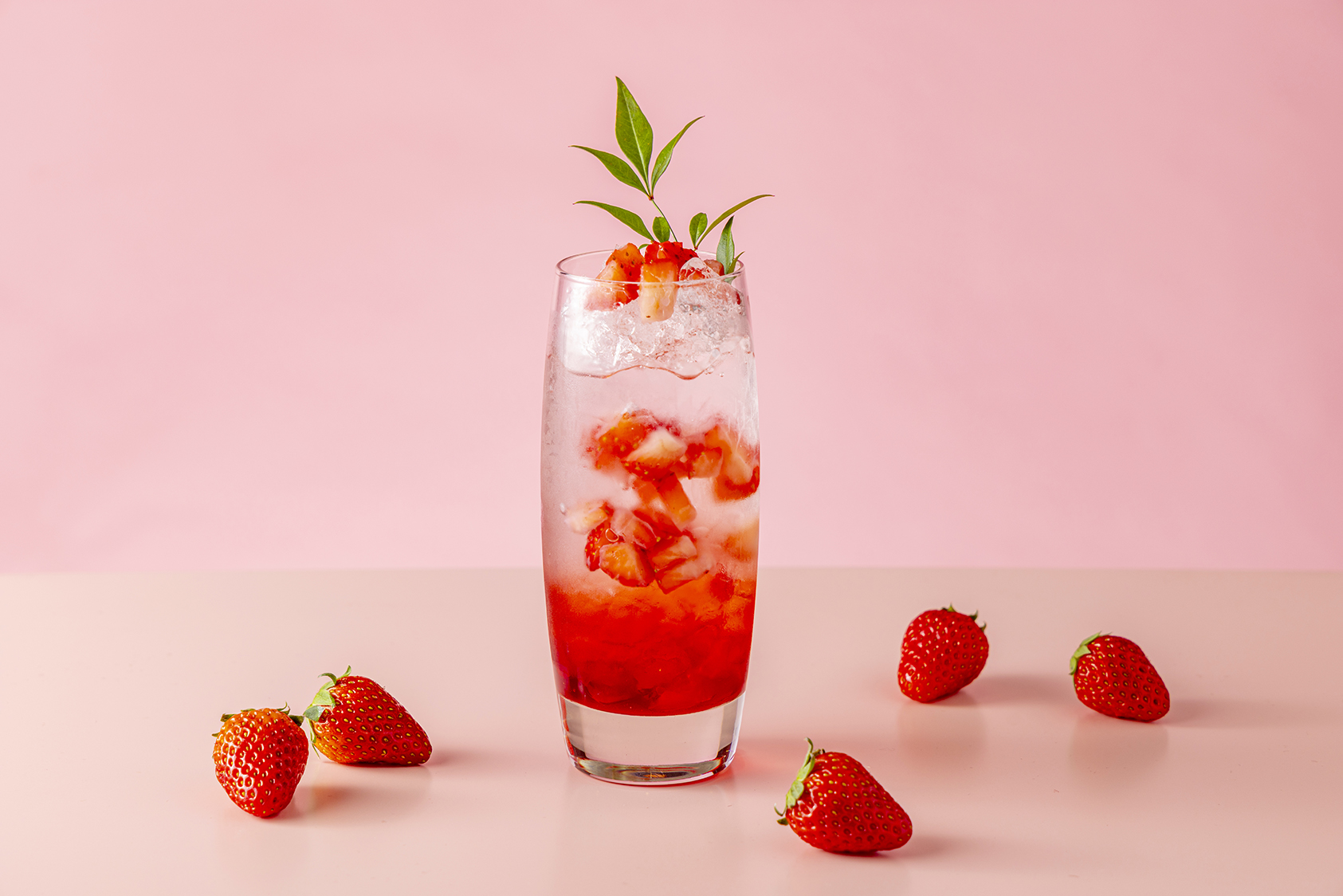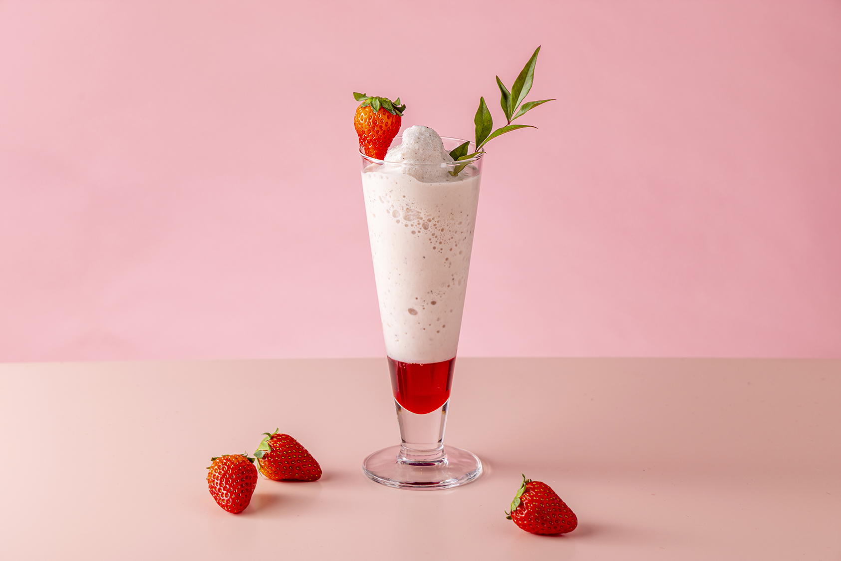 グラスの底のいちごシロップを混ぜる事により、飲む度に味わいの変化をお楽しみいただけます。